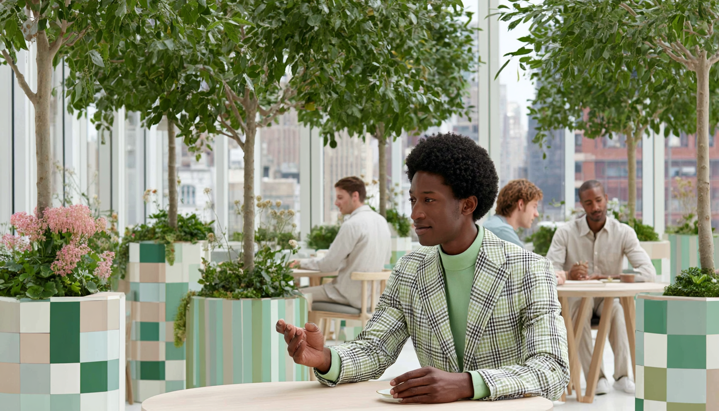 People in business attire engaging on a rooftop with city views, plants, and smiles, creating a vibrant, professional ambiance.