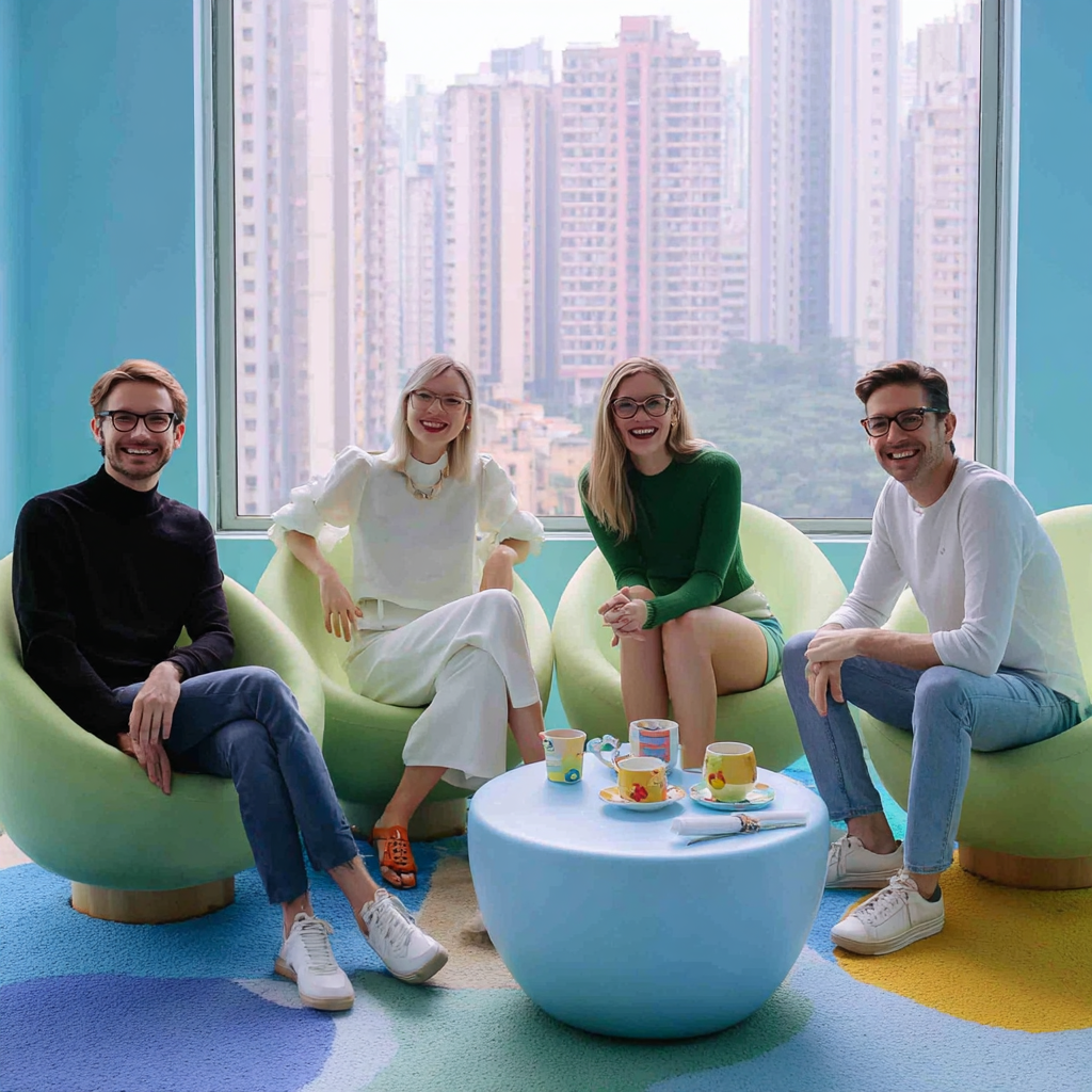 Four stylish individuals in colorful outfits at an event with cityscape views.